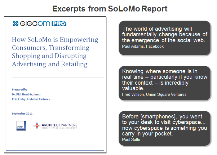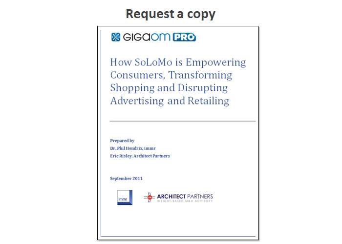 Part of our on-going research into SoLoMo, this is the first in a series of reports that will be published this fall. Other reports examine M-Commerce in more detail, Hyper-Local Advertising, and Digital Signals (the data generated by SoLoMo and other user activities and interactions). To request a copy of the SoLoMo brief, click here.